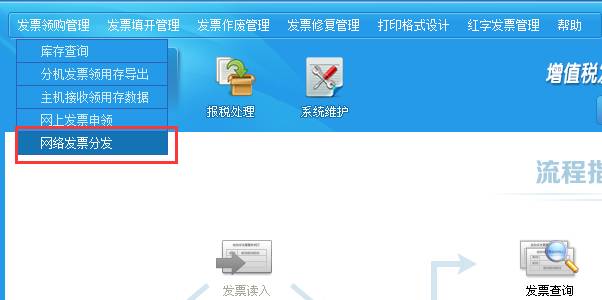 进入软件【发票管理】--【发票领购管理】--【网络发票分发】,进行发票分发即可。